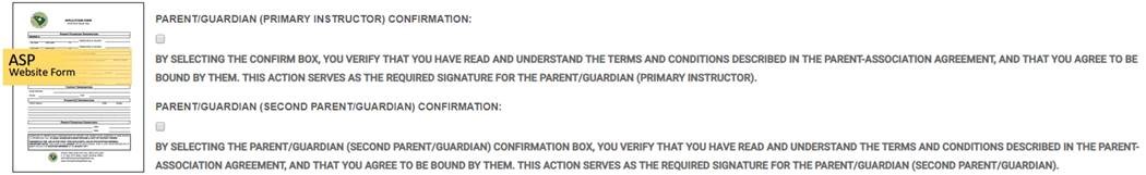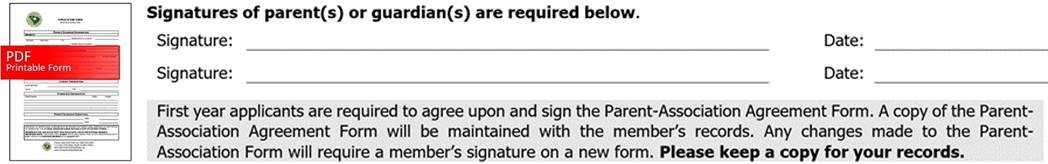 With the addition of our new online application process, signature requirements for the Parent-Association Agreement now follow two paths, printable format, and online format. Examples of the different arrangements are as follows.