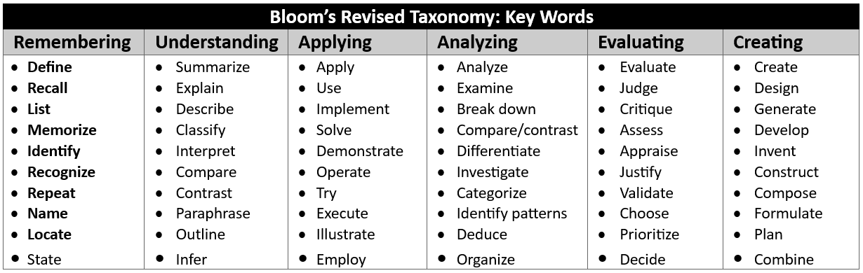 Bloom's Revised Taxonomy is a framework that classifies cognitive skills into six hierarchical categories. Here's a list of keywords for each category: